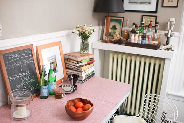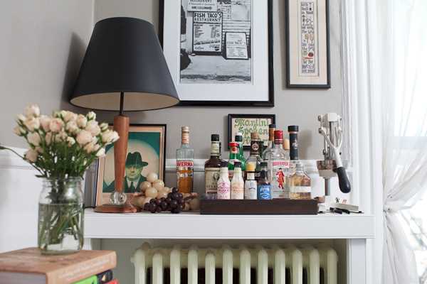 J’aime l’ambiance qu’elle a créée, à la fois simple et chaleureuse et j’aime l’idée du bar au dessus du radiateur avec une lampe élégante et des cadres de différentes tailles.