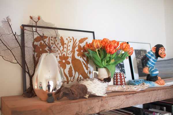 Son appartement est décoré de manière très naturelle et personnelle, avec des tonalités douces et beaucoup de petits détails qui donnent un aspect minimaliste et paisible. Les différentes nuances de beige et les touches de orange et de rouge me plaisent beaucoup.